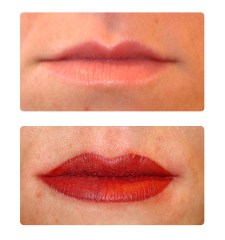 With permanent makeup, your lip line will be redefined and shaped the way they once were, or the way they should have been. The lip is then filled in with custom mixed color, the color you probably had in your youth. This gives the benefit of lip liner and a full healthy lip color in one procedure. For a deeper shade, darker colors may be used. »click on the pics below to enlarge